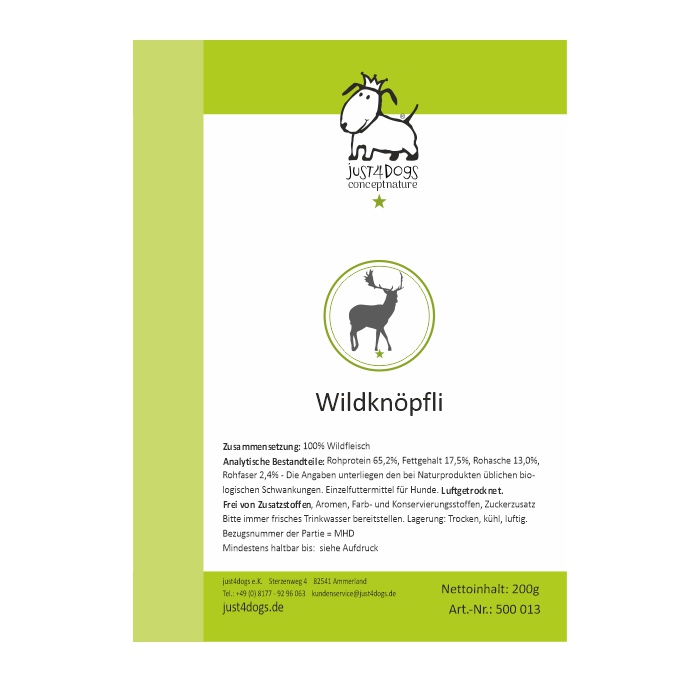 Wilde Leckerbissen aus 100% Wildfleisch. Die Wildknöpflis sind 1-2,5cm große luftgetrocknete knusprige Kugeln. Toll für Hundeschule, Suchspiele im Wald, fürs Training oder einfach nur so.