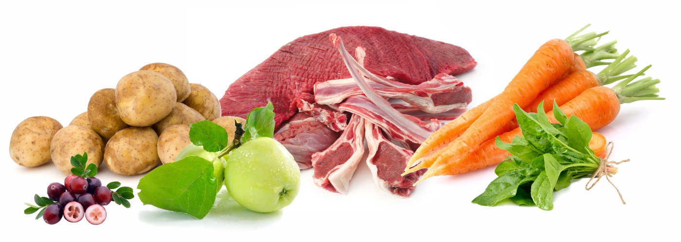 Wild 83% (bestehend aus Muskelfleisch, Herz, Lunge, Leber), Gurke 6%, Spinat 4%, Süßkartoffel 4%, Birne 2%, Knochenmehl vom Wild 1%